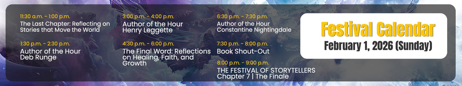 Welcome to The Festival of Storytellers a virtual event bringing together authors and readers worldwide. Enjoy live readings, Book Shoutout and interactive sessions with storytellers fromdiverse genres, all online and accessible from anywhere.