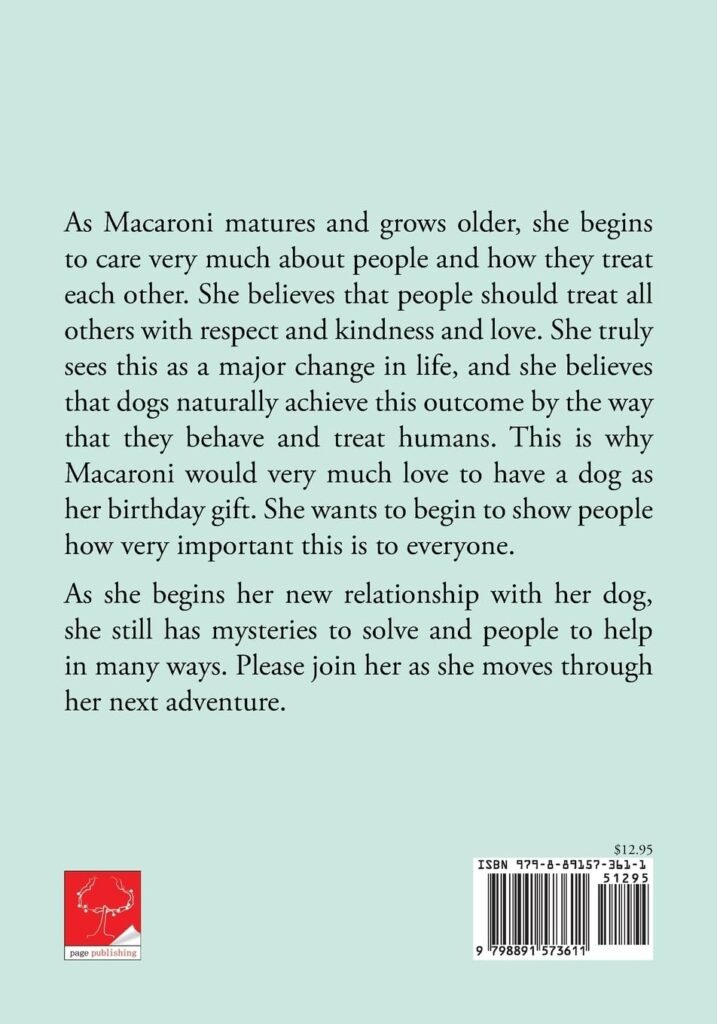 As Macaroni matures and grows older, she begins to care very much about people and how they treat each other. She believes that people should treat all others with respect and kindness and love. She truly sees this as a major change in life, and she believes that dogs naturally achieve this outcome by the way that they behave and treat humans. This is why Macaroni would very much love to have a dog as her birthday gift. She wants to begin to show people how very important this is to everyone.
