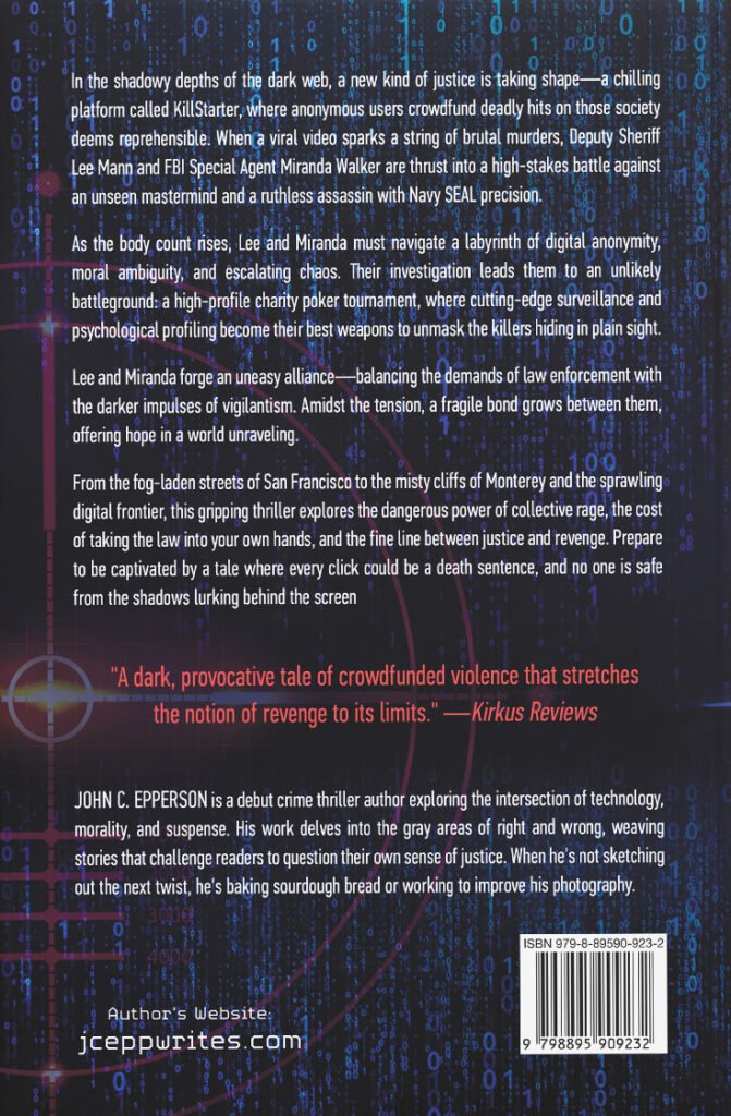 Mary Ellen LaFlame thinks she can outlast “cancel culture”—until a hooded stranger garrotes her in San Francisco fog and uploads proof of death to KillStarter, a dark-web platform that turns viral outrage into crowdfunded murder-for-hire. As bodies stack up, FBI cyber specialist Miranda Walker is sent west to brief local agencies on a threat that behaves like a meme—fast, contagious, and impossible to trace. She joins forces with Monterey County Deputy Lee Mann and his brilliant, chaotic IT aide Moss Pendleton. While Miranda fights Bureau politics and a media frenzy that glamorizes vigilantism, Lee and Moss build a war room to monitor contracts—until a low-bounty target is found with his neck snapped, proving KillStarter isn’t rumor. It’s infrastructure. The case detonates when a Hollywood predator, D’Wayne Robinson, becomes a multimillion-dollar target and a former Navy SEAL sniper accepts the contract. An ocean-side
