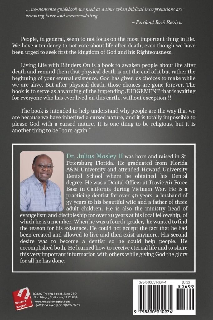 Living Life with Blinders On is a book to awaken people about life after death and remind them that physical death is not the end of it but rather the beginning of your eternal existence. God has given us choices to make while we are alive. But after physical death, those choices are gone forever. The book is to serve as a warning of the impending JUDGEMENT that is waiting for everyone who has ever lived on this earth.. without exception!!!