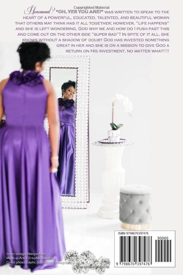 Phenomenal? “OH YES YOU ARE!” was written to speak to the heart of a powerful, educated, talented, and beautiful woman that others may think has it all together; however, “life happens” and she is left wondering God why me and how do I push past this and come out on the other side “super bad” in spite of it all. She knows without a shadow of doubt God has invested something great in her and she is on a mission to give God a return on His investment, no matter what!!!!