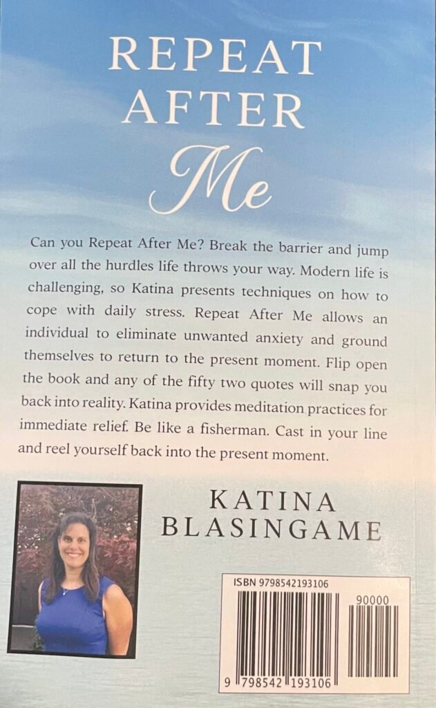 Can you Repeat After Me? Break the barrier and jump over all the hurdles life throws your way. Modern life is challenging, so Katina presents techniques on how to cope with daily stress. Repeat After Me allows an individual to eliminate unwanted anxiety and ground themselves to return to the present moment. Flip open the book and any of the fifty two quotes will snap you back into reality. Katina provides meditation practices for immediate relief. Be like a fisherman. Cast in your line and reel yourself back into the present moment.