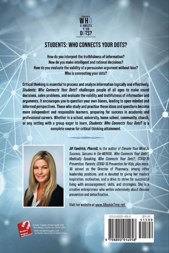 Critical thinking is essential to process and analyze information logically and effectively. Students: Who Connects Your Dots? challenges people of all ages to make sound decisions, solve problems, and evaluate the validity and truthfulness of information and arguments. It encourages you to question your own biases, leading to open-minded and informed perspectives. Those who study and practice these ideas and questions become more independent and responsible learners, preparing for success in academic and professional careers. Whether in a school, university, home school, community, church, or any setting with a group eager to learn, Students: Who Connects Your Dots? is a complete course for critical thinking attainment.