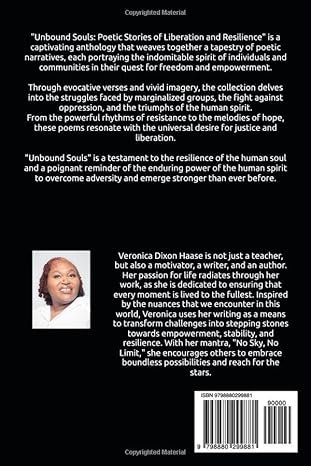 “Unbound Souls: Poetic Stories of Liberation and Resilience” is a captivating anthology that intricately weaves together the stories of black Queens from both historical and contemporary realms. Enhanced by rich illustrations that amplify the depth of each narrative, this anthology vividly portrays the unwavering spirit of individuals and communities in their relentless pursuit of freedom and empowerment. Through evocative verses and vibrant imagery, the collection immerses readers in the struggles faced by marginalized groups, the ongoing battle against oppression, and the triumphant resilience of the human spirit. From the powerful rhythms of resistance to the melodic echoes of hope, these poems and stories resonate with the universal longing for justice and liberation. “Unbound Souls” stands as a powerful testament to the enduring strength of the human soul and serves as a poignant reminder of our collective ability to rise above adversity and emerge stronger, more resilient, and more determined than ever before.